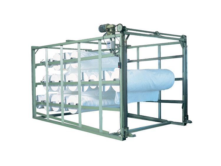 1.當落布車將布捲運送至本機時,布捲即會經由電動升降機,送到第 一、二、三 層,然後經由斜度軌道逐一滾至前端及中。